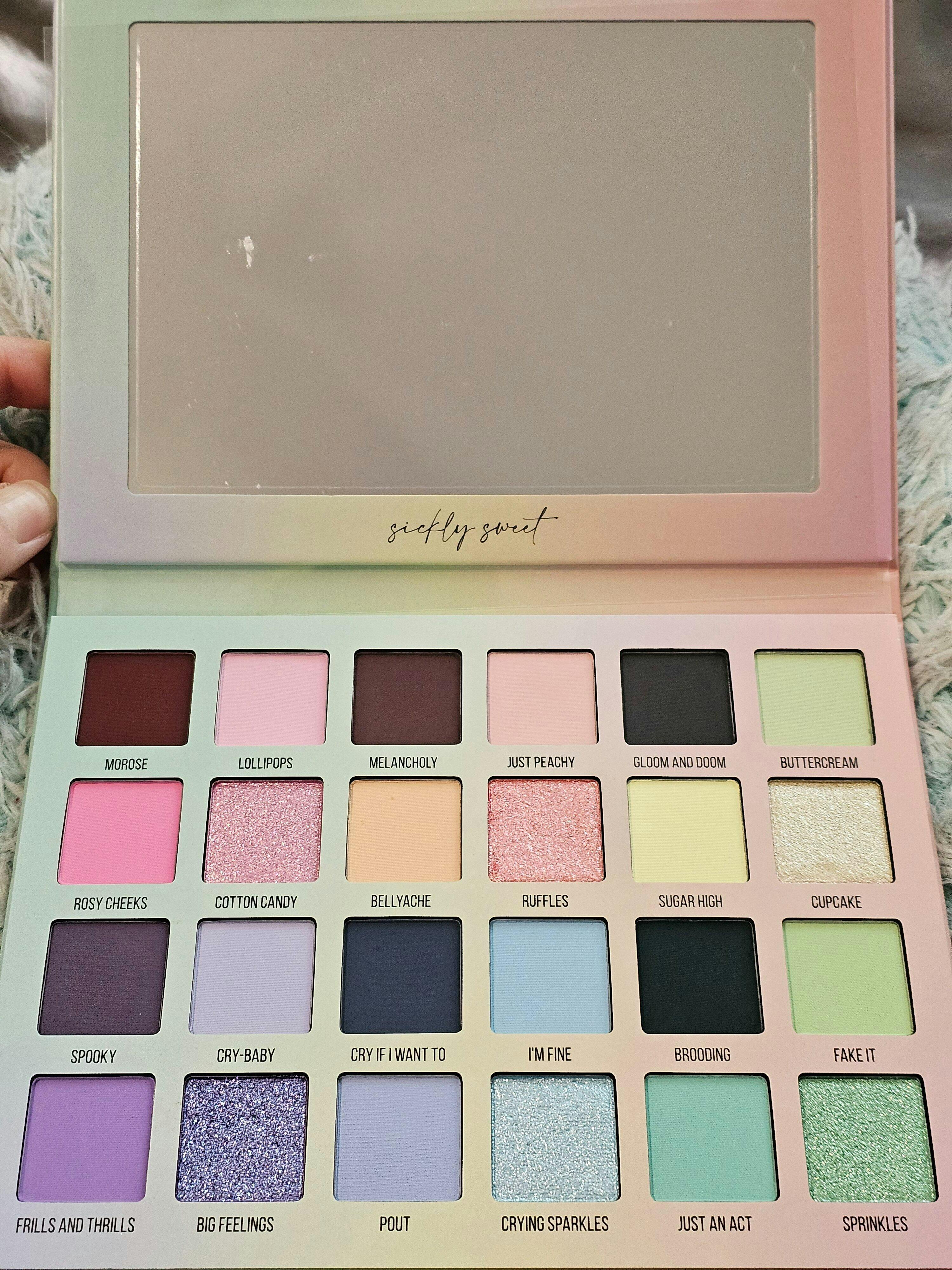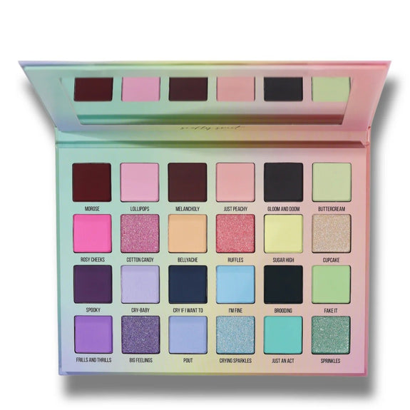 Inspired by everything sweet and whimsical—ruffles, cupcakes, and lollipops—this palette also brings in the darker side: tears, bellyaches, grumpiness, and the blues. It’s a perfect mix of sweet and sour, light and dark, allowing you to create looks that are as playful as they are mysterious.