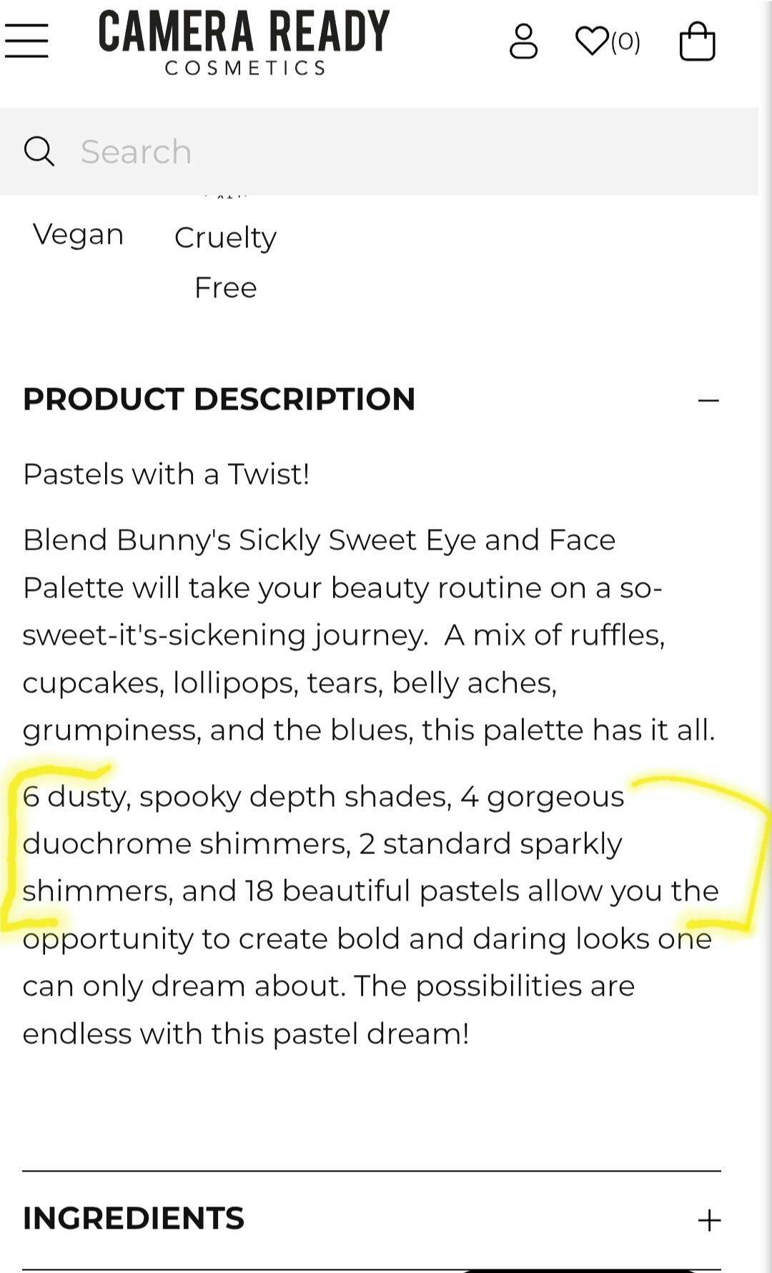 EYESHADOW INGREDIENT (GLOOM AND DOOM,FAKE IT,BUTTERCREAM,BROODING,JUST AN ACT,SPRINKLES,BELLYACHE,CRYING SPARKLES)