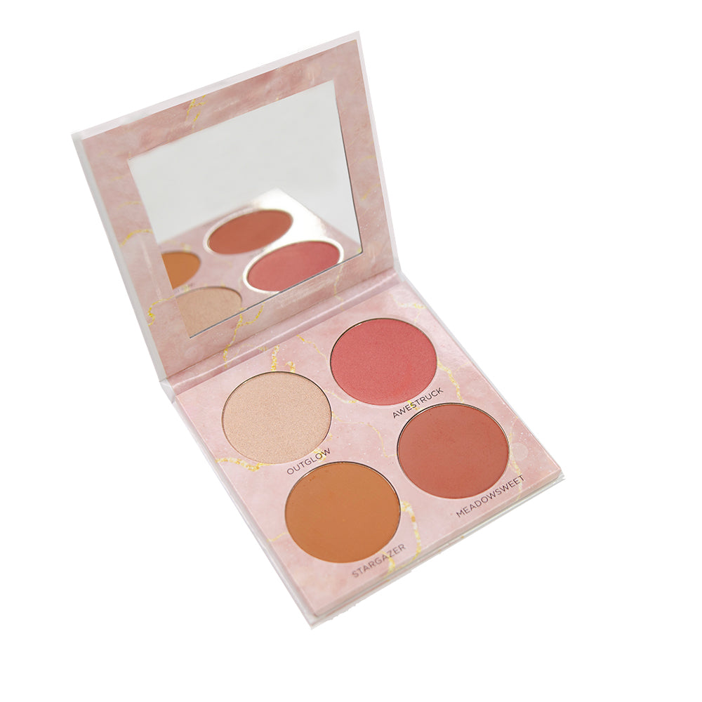 This four-pan face palette contains 1 bronzer, 1 highlighter, 1 shimmer blush, and 1 matte blush curated for fair, medium, and deep skin tones.