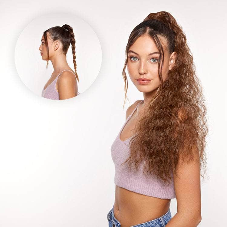 These pre-styled, weatherproof ponytails are the easiest way to switch up your hair color, style, length, or texture without the commitment or harmful chemical & heat damage.